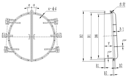 其技術(shù)內(nèi)容是將門軸傾斜(設(shè)計了δ角和γ角),從而使拍門向內(nèi)和向后 傾斜。這樣當(dāng)門頁離開管口位置時,門重的水平面分力會促使拍門關(guān)閉。利用 門頁自重的水平分力作為閉門動力(利用的重力僅占自由懸掛式拍門全部重量 的 1/10 左右),克服了自由懸掛式拍門無自閉能力的技術(shù)缺陷。