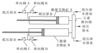 低壓原水從單向閥 A 或單向閥 C 進入能量回收裝置,充滿能量交換缸 A 或 能量交換缸 B;高壓濃水從五通換向閥進入能量回收裝置,當五通換向閥使高 壓濃水與能量交換缸 A 連通時,高壓濃水將能量傳遞給低壓原水,實現能量交 換,高壓原水從單向閥 B 進入反滲透膜壓力容器進行脫鹽處理;待將能量交換 缸 A 中的原水全部加壓送至反滲透系統后,五通換向閥,將高壓濃水與能量交 換缸 B 連通,重復上述能量交換過程,同時能量交換缸 A 中低壓原水進入,排 出低壓濃水。兩個能量交換缸交替進行高壓濃水與低壓原水的能量交換,實現 將低壓原水連續增壓送至反滲透系統進行脫鹽處理。