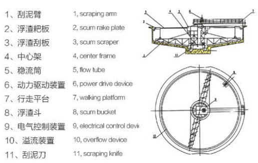 特點(diǎn):該機(jī)采用中心傳動(dòng)垂架式,下部采用整體對數(shù)螺線刮 板,上部設(shè)有浮渣收集裝置,池壁四周設(shè)溢流裝置及浮渣 排出裝置。該機(jī)傳動(dòng)機(jī)構(gòu)為行星擺線針輪減速機(jī)與帶外齒 的大型回轉(zhuǎn)支承二級減速具有傳遞扭矩大,運(yùn)轉(zhuǎn)平穩(wěn),穩(wěn) 流效果好等優(yōu)點(diǎn)。